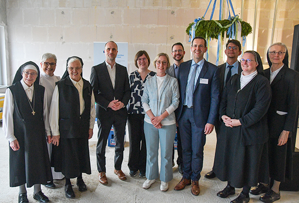 Das Jahr fängt gut an – Richtfest über den Dächern von Speyer: Sebastian Schäfer und Barbara Brandt (Pflegedirektoren), Clemens Hoch (Minister für Wissenschaft und Gesundheit), Dr. Wolfgang Schell und Oliver Heath (Vorstand der Krankenhaus-Stiftung der Niederbronner Schwestern), Oberbürgermeisterin Stefanie Seiler, Phillip Nowak (Verwaltungsdirektor), Sr. Beata Maria (Oberin im Sankt Vincentius Krankenhaus), Sr. Barbara Geißinger (Provinzoberin der Kongregation der Niederbronner Schwestern, Provinz Deutschland-Österreich), Sr. Klara Sexlinger (Generalassistentin, Generalrat der Kongregation der Niederbronner Schwestern, Elsass), Pastoralreferentin Sigrid Sandmeier