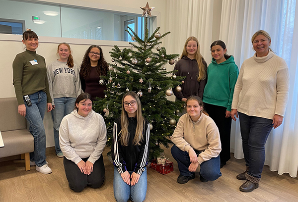 Schülerinnen schmücken Tannenbäume für Patienten und Mitarbeitende