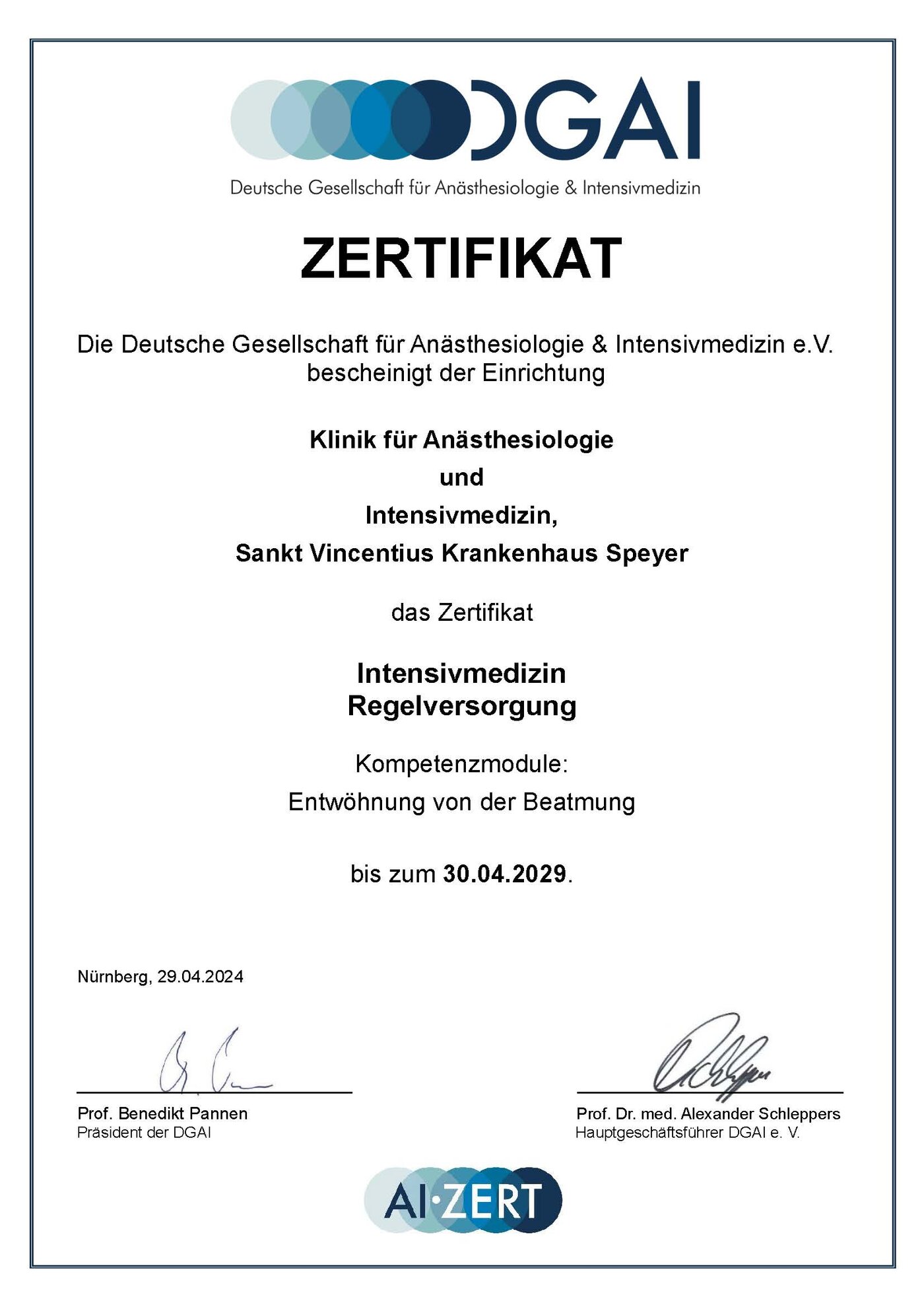 - Intensivstation und Weaning-Zentrum durch die Deutsche Gesellschaft für Anästhesiologie und Intensivmedizin e.V. (DGAI)